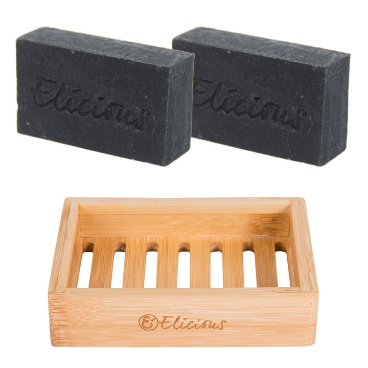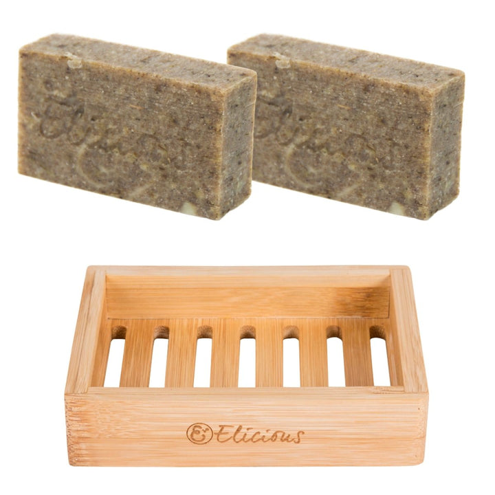 Natuurlijke biologische zeep Charcoal Lavender – Set van 2 met duurzaam bamboe zeepbakje