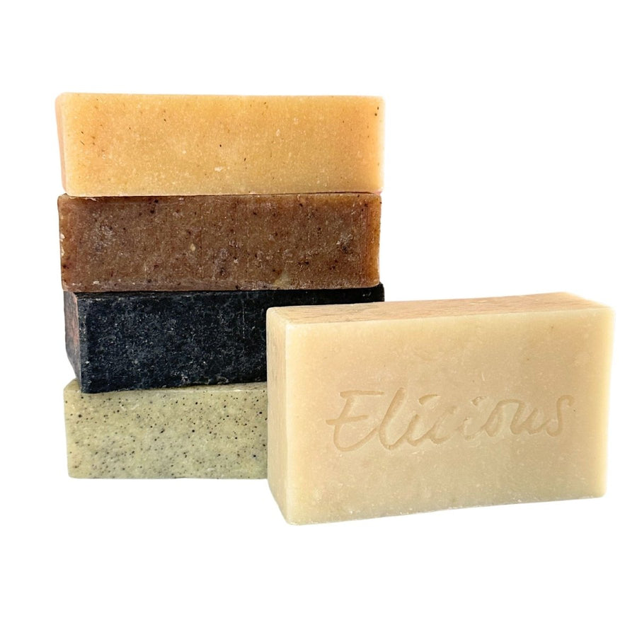 Dieses Bundle enthält fünf handgemachte natürliche Seifen von Elicious: Volcano Scrub, Grease Monkey, Serene Sandalwood, Myrtle Lemongrass und Imperial Peppermint.